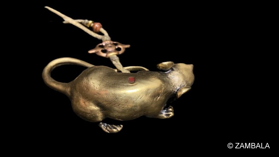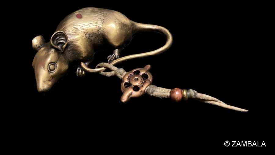 - 如意鼠主要與財寶天王修法相關,特別在寧瑪派、薩迦派、噶舉派及格魯派中,財寶天王的修持廣泛流行。如意鼠作為財寶天王的標誌,常出現在財神法會、供養儀軌及寺院造像中。