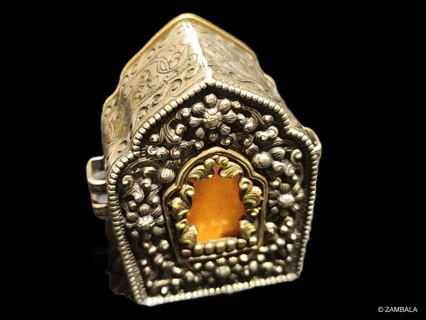 4. **文化與藝術價值**:嘎屋通常由金屬(如銀、銅)、寶石或木材製成,表面常刻有佛像、咒語(如六字真言)或吉祥圖案,體現藏傳佛教的藝術精髓。它既是宗教聖物,也是藏族文化的代表。