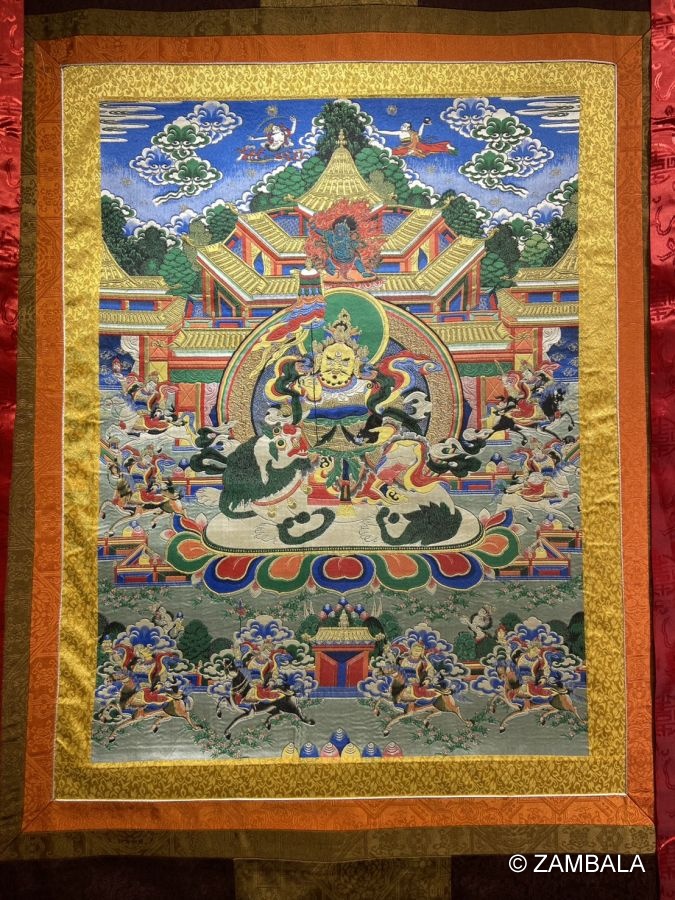 - 在藏傳佛教中,他被認為是南方寶生佛或北方不空成就佛的化現,具備出世間護法的功德,與金剛手菩薩有密切淵源,屬於其部屬。