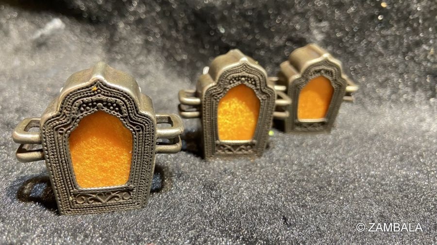 - 嘎屋內通常放置有佛經(如《般若波羅蜜多心經》)、咒語(如六字真言「唵嘛呢叭咪吽」)、聖土、聖水、藥丸(藏藥或加持物)或其他聖物。這些物品被認為能增強佩戴者的靈性力量,幫助修行或淨化業障。