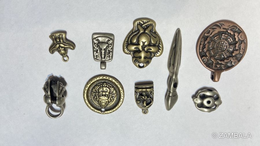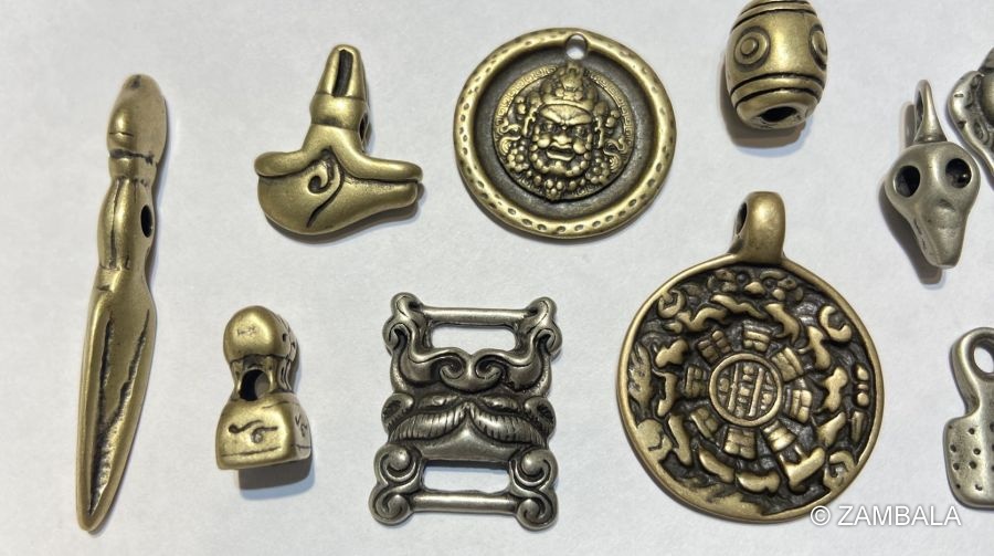 2. **金屬或寶石吊飾**:刻有咒語或本尊圖像的吊飾,如觀音菩薩或蓮花生大士的形象。
