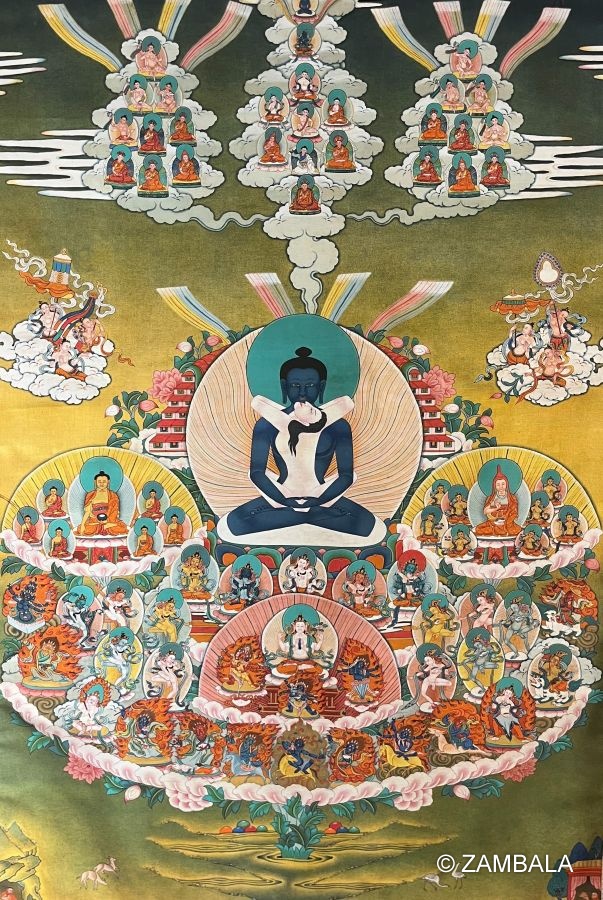 - 在唐卡中,普賢王如來通常呈現藍色身相,無衣飾,象徵法身無相、無執的純淨本性;佛母則為白色,代表空性與智慧。二者相擁,表達「方便與智慧雙運」,即修行中慈悲與智慧的不可分割。