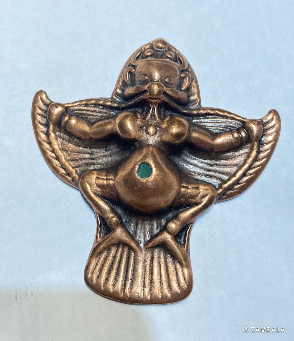 大鵬金翅鳥在藏傳佛教中的形象深受西藏本土苯教(Bon)影響。在苯教中,大鵬金翅鳥被視為神聖的靈鳥,與天空、風與靈性力量相關。藏傳佛教吸收了這一意象,將其融入金剛乘的修持中,特別是在與護法神相關的儀式中。大鵬金翅鳥常出現在唐卡、曼陀羅與寺院壁畫中,體現其神聖地位。