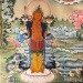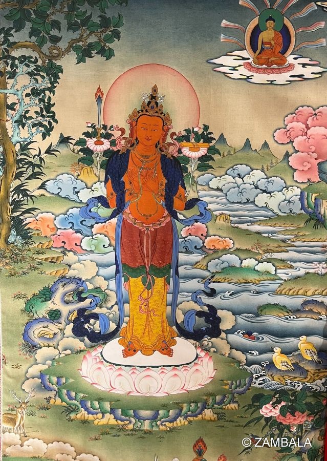 4. **雙肩各托一朵蓮花**,左側蓮花上通常會出現**智慧劍**,右側蓮花上通常是**般若經典**,但在此唐卡中象徵性可能較含蓄或尚未展開,視繪製風格而定。