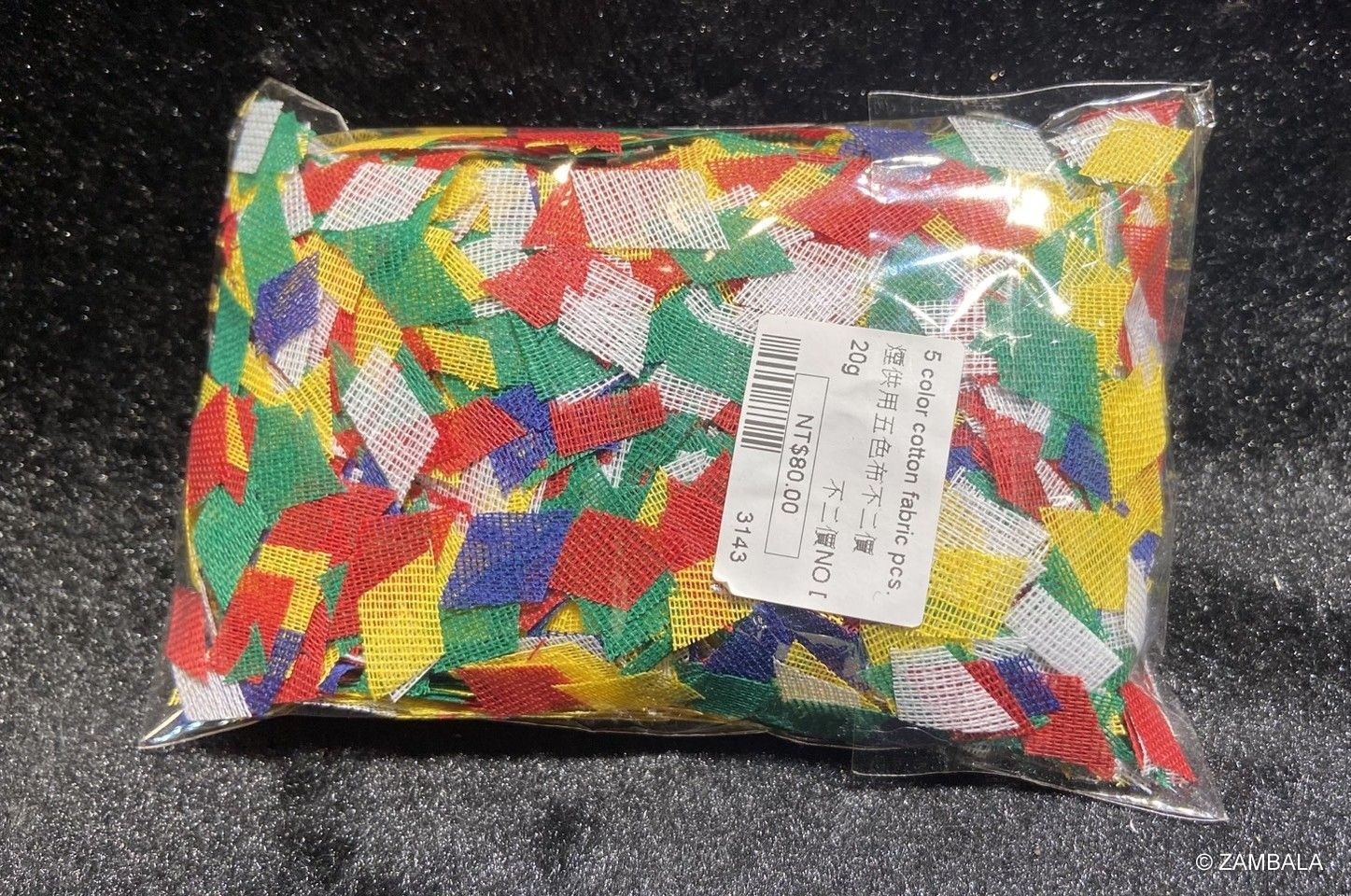 - **選材**:五色布通常選用棉、麻或絲質材料,裁成小塊或條狀,顏色為白、紅、藍、綠、黃,象徵五方佛及五元素。這些布料通常是乾淨且未經污染的,以確保供品的純淨。
