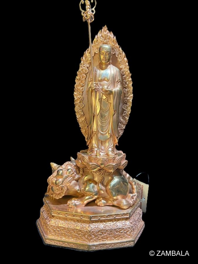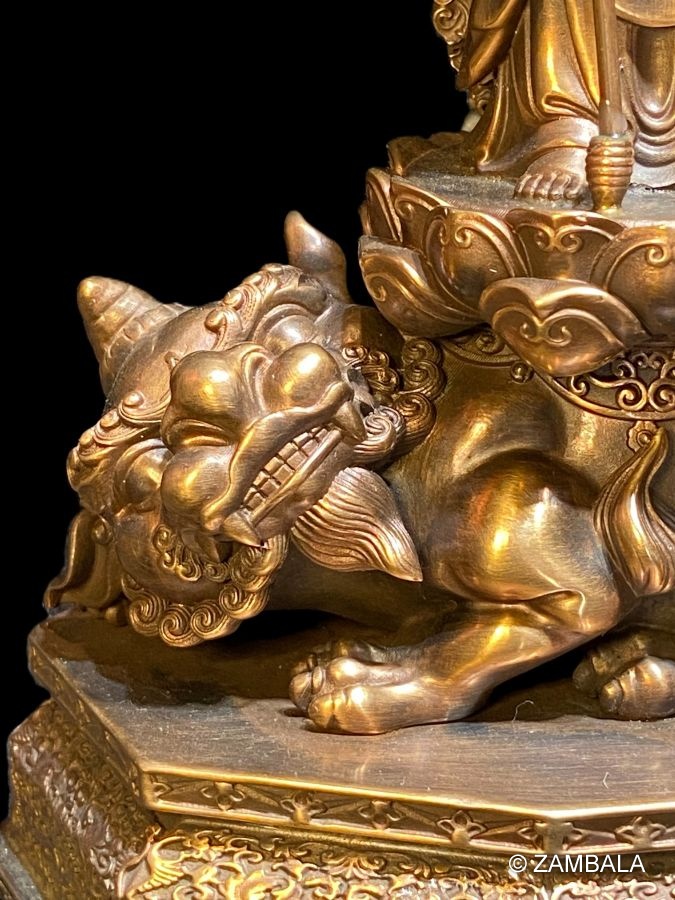然而,在某些特殊傳承或地方性實踐中,地藏王菩薩偶爾被描繪為乘騎一頭**青獅**或**白獅**,這與藏傳佛教中其他菩薩(如文殊菩薩)的座騎有相似之處。青獅象徵勇猛與智慧,能驅逐邪魔並護持佛法。這種形象的由來可能受到漢傳佛教或印度佛教的影響,因為在漢傳佛教中,地藏王菩薩有時被描繪與一頭名為**諦聽**的神獸相關聯。諦聽是一種神話中的靈獸,據說能辨別善惡、聽聞眾生心聲,幫助地藏王菩薩救度眾生。