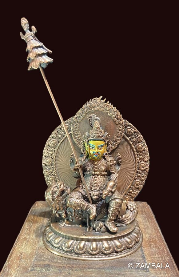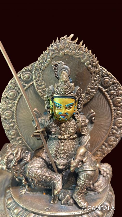 財寶天王(梵文:Vaiśravaṇa,藏文:རྣམ་ཐོས་སྲས་,Namthöse),又稱多聞天王或毘沙門天王,是佛教四大天王之一,負責守護北方。在藏傳佛教中,他被視為重要的護法神(Dharma Protector)和財富之神(Deity of Wealth),其形象通常為騎乘雪獅的戰士形態,手持寶塔或吐寶鼠,象徵保護與繁榮。 他的地位在藏傳佛教各派中相當崇高,尤其在格魯派(Gelug)中,他與六臂大黑天(Shadbhuja Mahakala)和閻魔法王(Yama Dharmaraja)並列為三大主要護法神,負責守護教法、消除障礙,並賜予修行者物質與精神上的富足。 在藏傳佛教的密續(Tantra)傳統中,受印度密教影響,他被融入複雜的儀式系統,成為象徵「內在財富」(精神自由)和「外在財富」(物質繁榮)的雙重守護者。