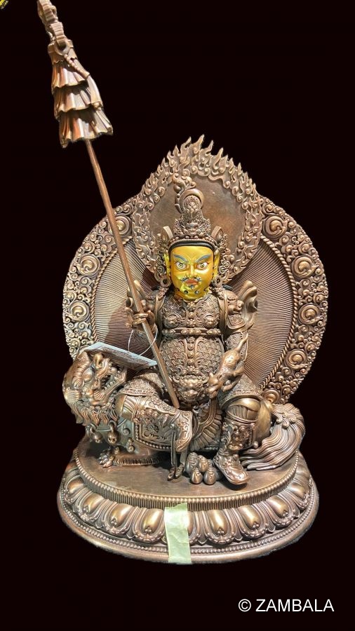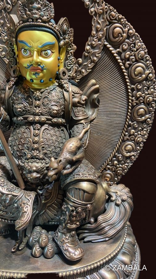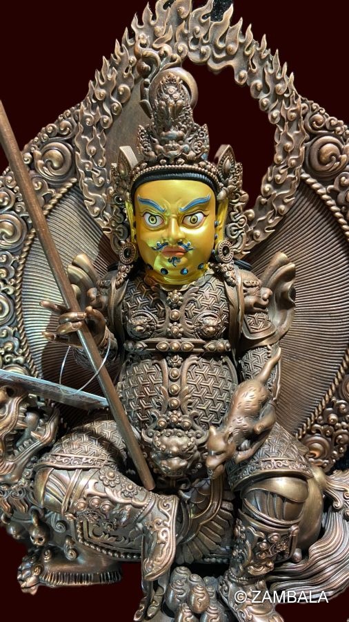 財寶天王(梵文:Vaiśravaṇa,藏文:རྣམ་ཐོས་སྲས་,Namthöse),又稱多聞天王或毘沙門天王,是佛教四大天王之一,負責守護北方。在藏傳佛教中,他被視為重要的護法神(Dharma Protector)和財富之神(Deity of Wealth),其形象通常為騎乘雪獅的戰士形態,手持寶塔或吐寶鼠,象徵保護與繁榮。 他的地位在藏傳佛教各派中相當崇高,尤其在格魯派(Gelug)中,他與六臂大黑天(Shadbhuja Mahakala)和閻魔法王(Yama Dharmaraja)並列為三大主要護法神,負責守護教法、消除障礙,並賜予修行者物質與精神上的富足。 在藏傳佛教的密續(Tantra)傳統中,受印度密教影響,他被融入複雜的儀式系統,成為象徵「內在財富」(精神自由)和「外在財富」(物質繁榮)的雙重守護者。