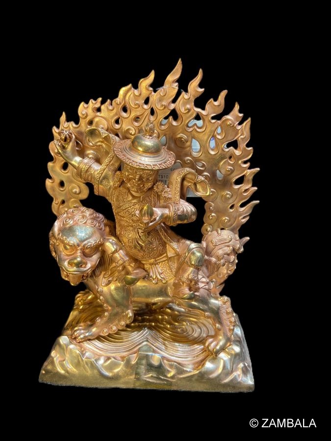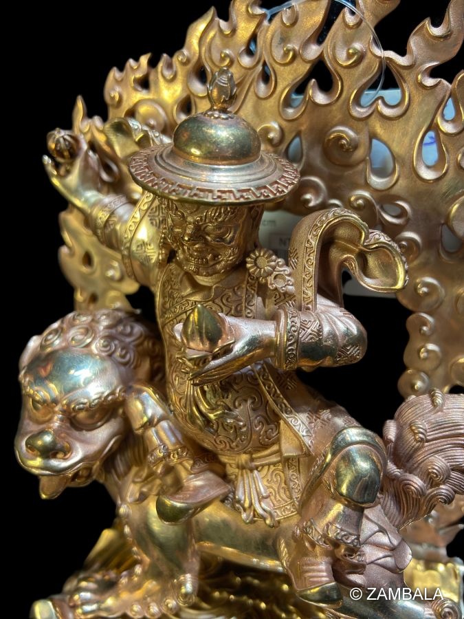 膽堅多傑列巴就示現,身體是白色的,頭頂上帶著一頂帽子,腳上穿著厚厚大大的鞋子,騎在一頭母獅子身上就示現在蓮師的面前,就跟蓮師講無論你在印度也好在尼泊爾到西藏也好,我都會護持你的教法,
