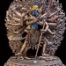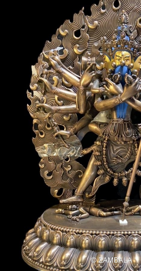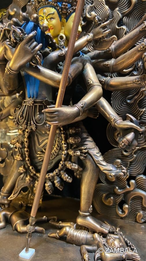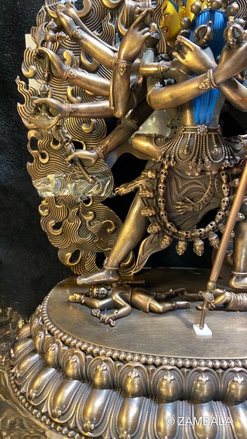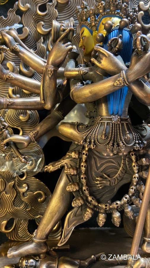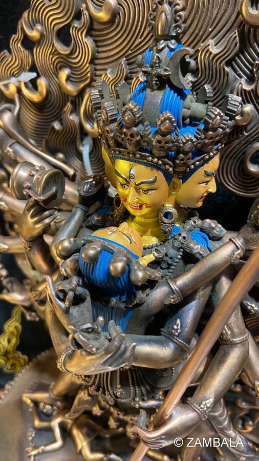 2. **象徵意義**:勝樂金剛通常以忿怒相(Heruka)示現,藍色身軀,擁有多面多臂,象徵多面向的智慧與力量。他與明妃金剛亥母(Vajrayoginī)雙運的形象,代表智慧與慈悲的結合,體現空性與大樂的統一。這種雙運形象在密宗中是修行的核心象徵,旨在幫助修行者超越二元對立,證悟究竟實相。
