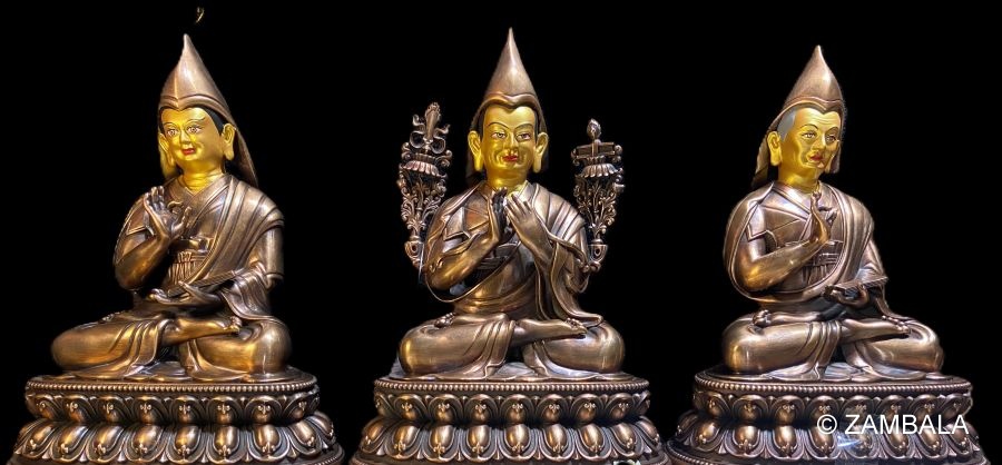 - **觀想**:在格魯派的密宗修行中,師徒三尊常被作為觀想對象,特別是在上師瑜伽(Guru Yoga)中。修行者將宗喀巴及其弟子視為上師、佛陀與本尊的化身,通過觀想與祈請獲得加持,淨化業障並增進智慧。