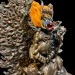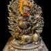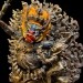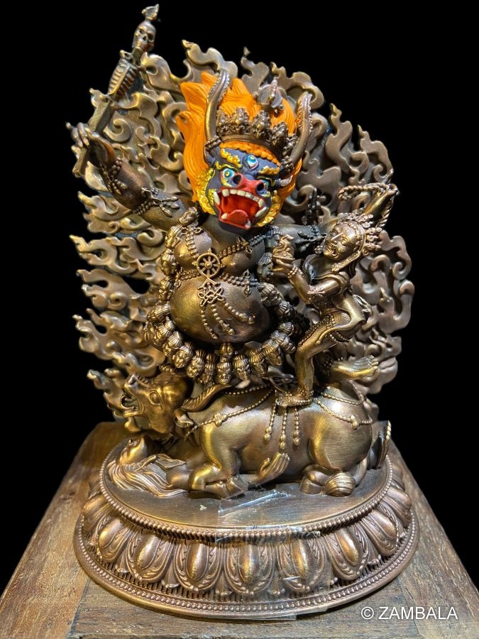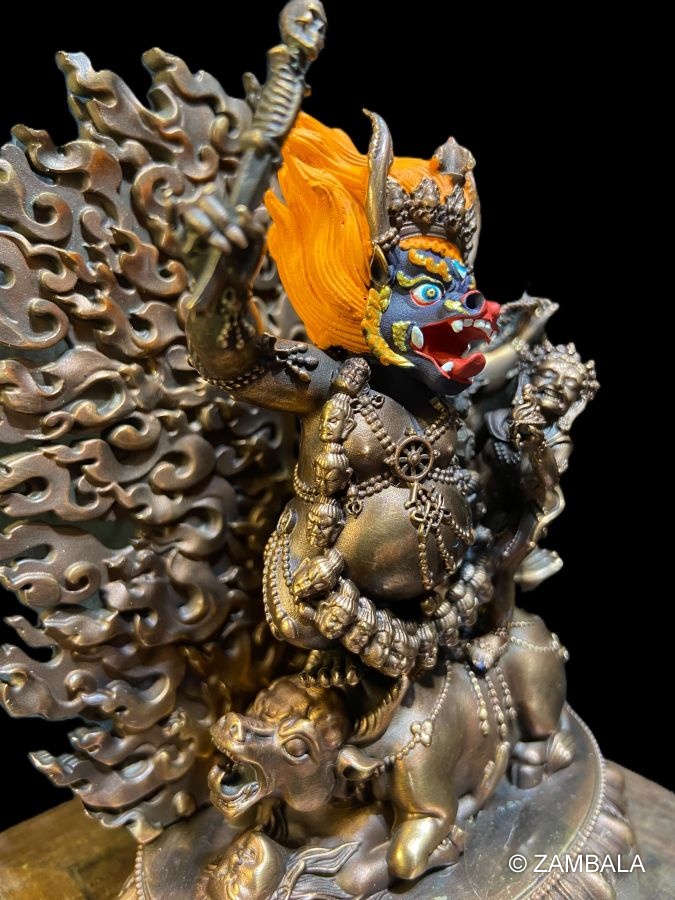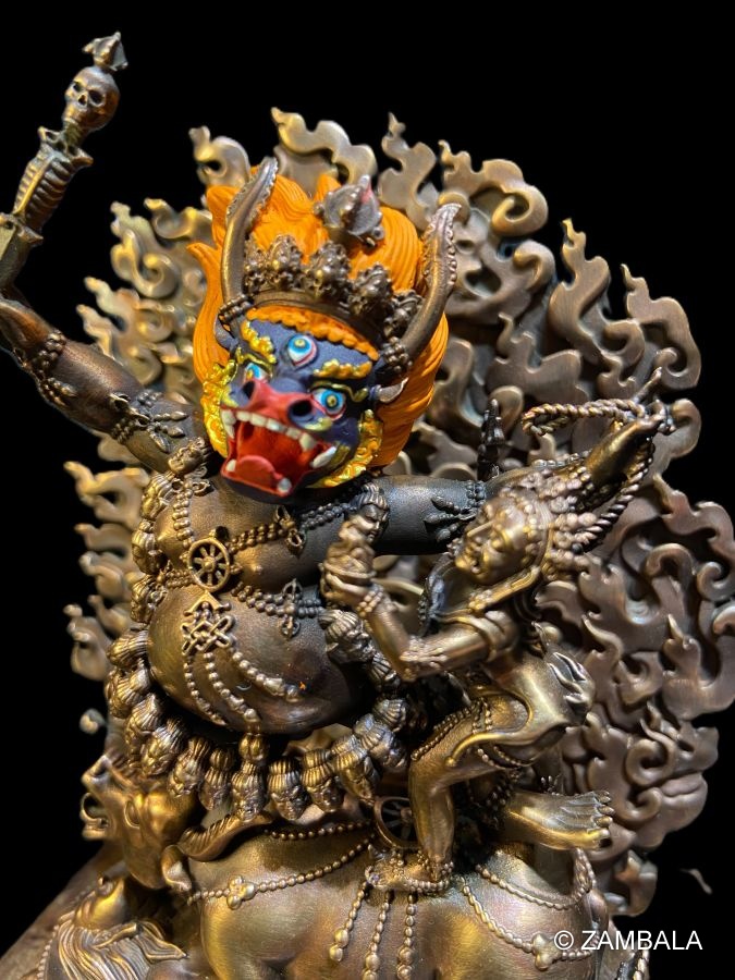 - **骨杖(右手持有)**:這是一根由人類脊柱和頭骨融合而成的杖,有時被描述為杖或錘(khatvanga)。其由來可追溯到古代印度神話中閻羅王(Yama)的權杖,象徵審判與懲罰。在佛教中,它被轉化為護法工具,代表征服死亡與業力的力量。典故上,這根骨杖象徵斬斷輪迴的枷鎖,源自《金剛怖畏根本續》(Shri Vajramahabhairava Nama Tantra),其中文殊菩薩化現為外閻羅來喻示性地征服死亡(Yama)。在密宗修行中,它用來擊碎妄想與惡業,提醒眾生業報的無情。