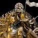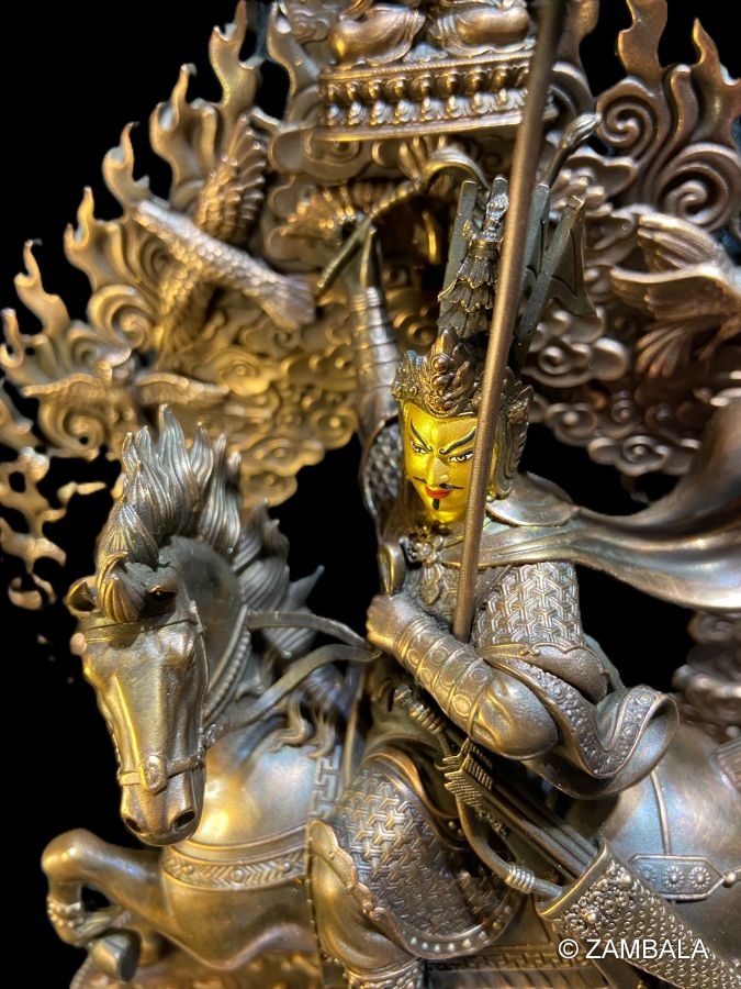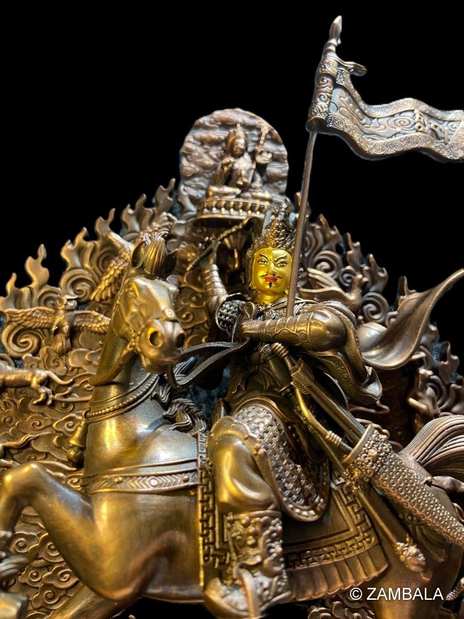 服飾與裝備:他通常身著華麗的藏式戰甲,甲胄上雕刻有佛教符號或神獸圖案,象徵其神聖使命。頭戴戰盔,盔上常飾有代表勝利與權威的羽毛或寶石。他的披風隨風飄揚,增添了英雄的氣勢。