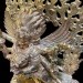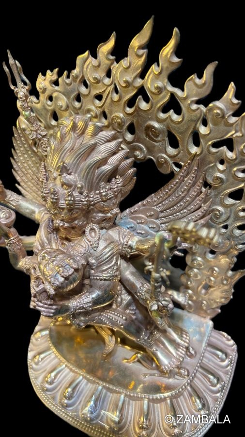 - 上方右手呈現威脅手印(tarjani mudra),食指上舉,釋放智慧之火。
