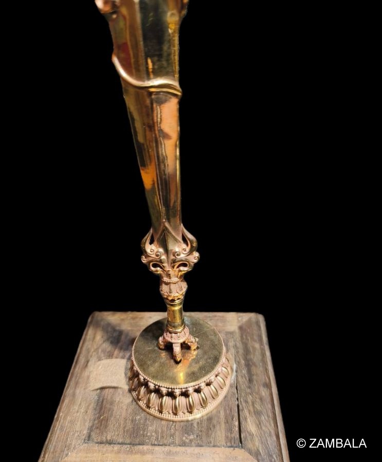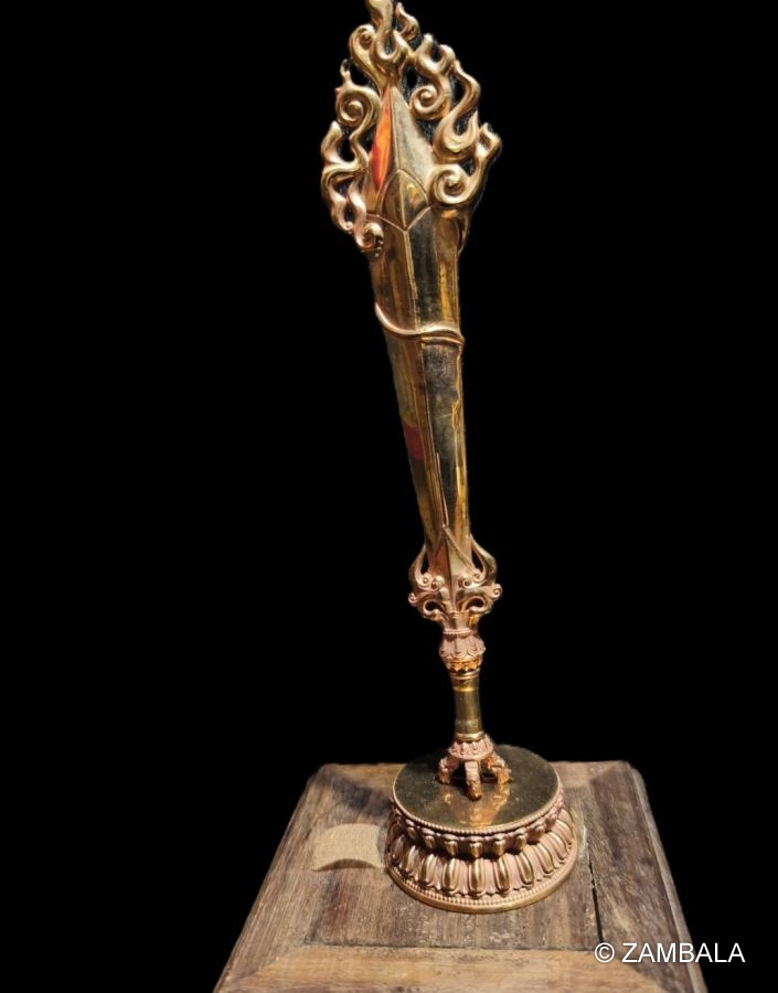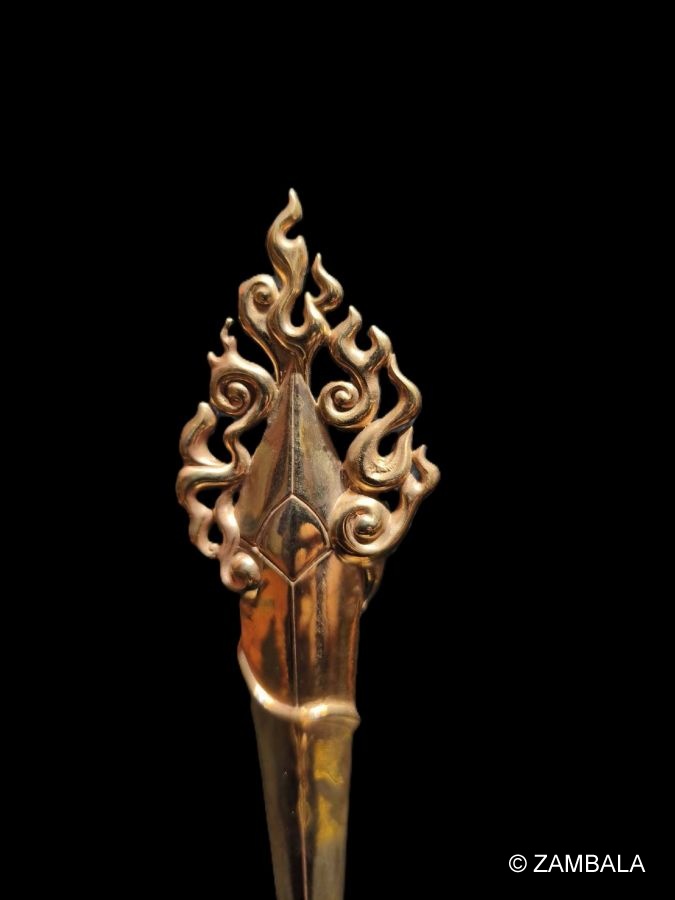 智慧劍的由來源自佛教的密教傳統和象徵主義,起源於印度大乘佛教的經典描述,後傳入中國和西藏佛教。根據佛教經論,如《華嚴經》、《金剛頂經》等,文殊菩薩的形象在公元5世紀左右的印度佛教藝術中已出現,但智慧劍的具體象徵在唐代中國佛教中被廣泛詮釋和定型。劍身以藍色鐵製成,雙刃設計,劍身盤繞火焰,劍柄以黃金鍛造,頂端飾以半截五股金剛杵,劍尖周圍放射智慧之火。這把劍並非世間的殺伐之器,而是象徵菩薩的無上智慧,能夠如利刃般切割眾生的無明、貪嗔癡等煩惱,讓人心生覺悟。 在佛教藝術中,文殊菩薩右手持劍高舉,寓意主動出擊斷除妄念;左手持蓮花則代表慈悲與智慧的平衡。這種形象在唐卡畫、雕塑和寺廟壁畫中屢見不鮮,例如五台山文殊院的文殊像,便以智慧劍為核心元素。