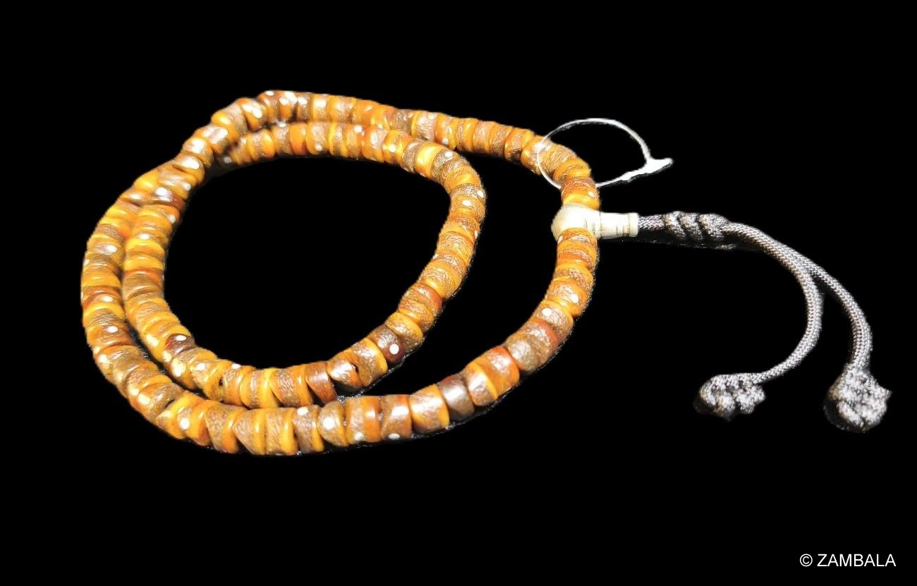 喇嘛骨念珠(也稱為人類頭骨念珠或骨mala)是藏傳佛教(特別是密宗或金剛乘)中一種特殊的法器,主要用於冥想和儀式實踐。它通常由108顆珠子組成,每顆珠子來自已故喇嘛或其他修行者的頭骨或其他骨頭,串成一串,並配以絲線或人髮作為繩索。在佛教儀式中,它的首要角色是作為計數工具,用來追蹤念誦咒語(mantra)的次數。例如,在冥想過程中,修行者會一顆一顆地撥動珠子,每撥一顆代表念誦一次咒語,通常以100次為一輪,額外的8顆珠子用來彌補可能的計數錯誤或遺漏。這種實踐不僅幫助集中注意力、平靜心靈,還被視為積累功德的手段,能夠改善當前生命、未來轉世,甚至家族業力。