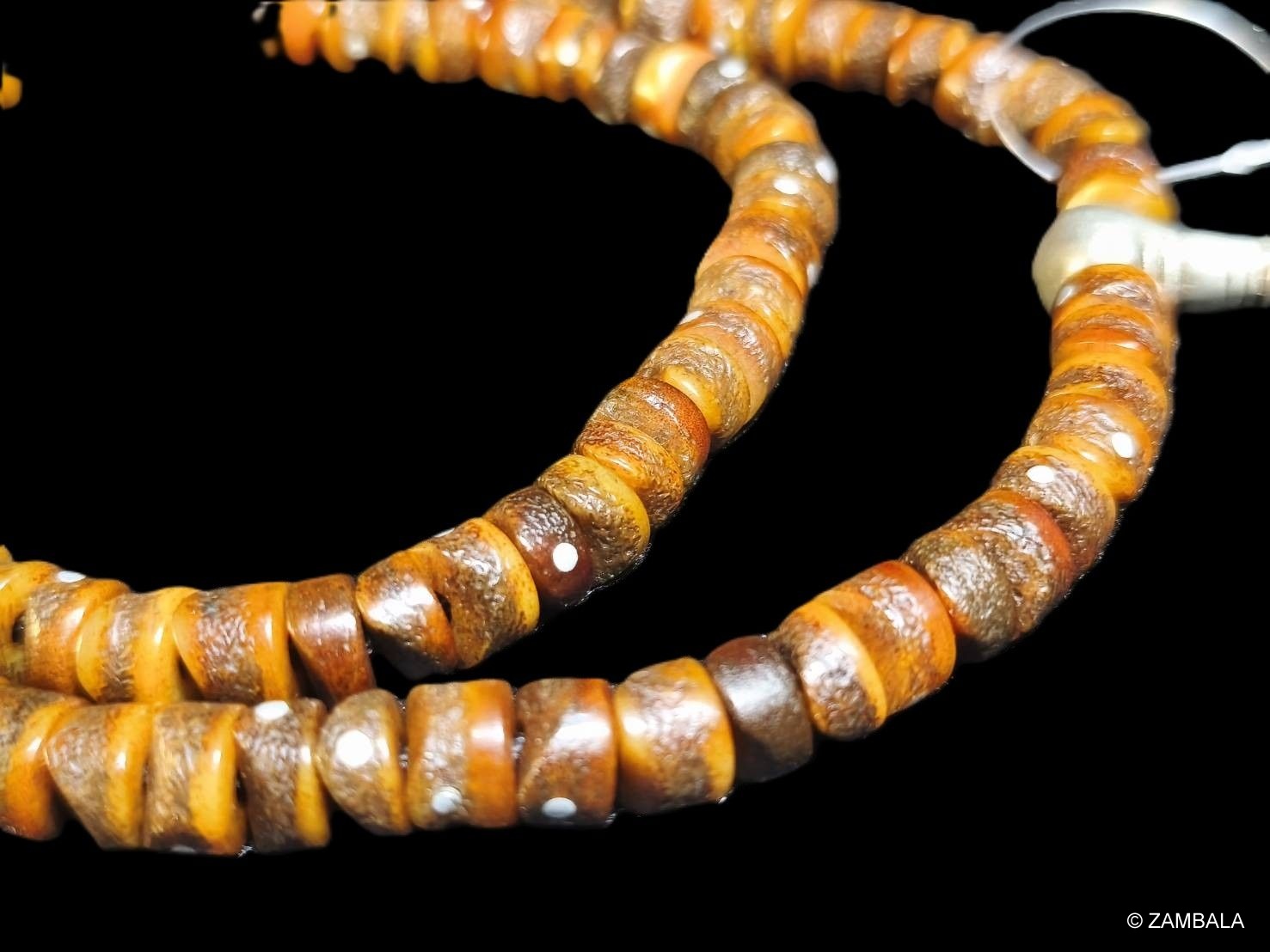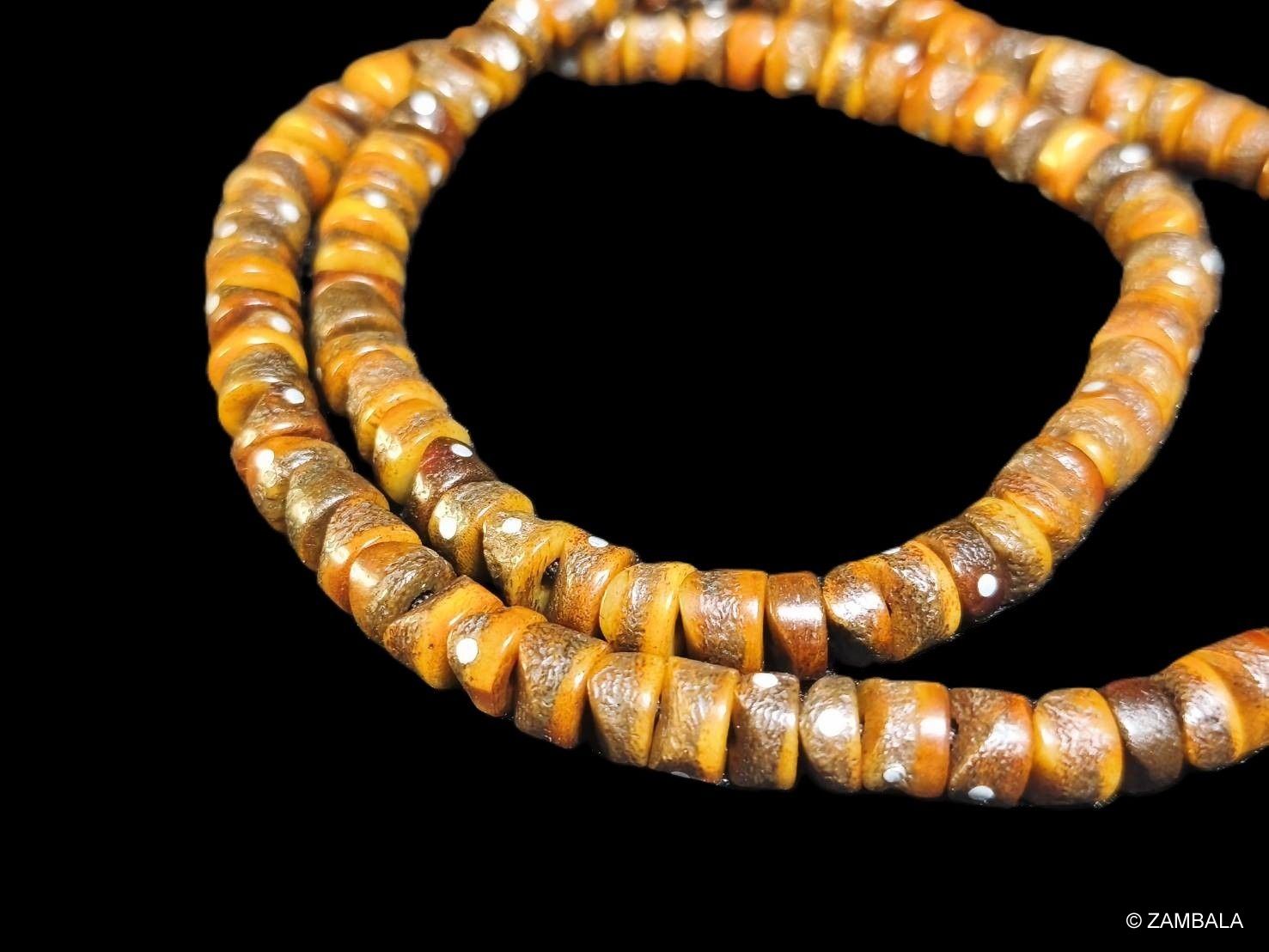在西藏,骨念珠的製作傳統根植於當地文化和佛教教義。人骨通常來自已故喇嘛、僧侶或自願捐獻遺體的村民,這些骨頭被視為靈性用途的捐贈。製作過程嚴格:珠子由頭骨或其他骨頭雕刻而成,繩索常用絲綢或人髮,由處女或密宗傳承者串成3到9股(3股代表三寶,9股代表金剛持和八菩薩)。骨頭的選擇至關重要,其力量取決於來源:最強大的來自被處決或謀殺者,其次是意外暴死者,而兒童(尤其是青春期前死亡)或亂倫出生者的骨頭也被視為高度有力的。這種使用人類遺骸的傳統反映了藏傳佛教對無常的強調,以及與古西藏苯教(Bön)的融合,後者也涉及薩滿儀式和骨器。骨念珠僅限於已入門的修行者使用,未經授權者可能被視為不敬。