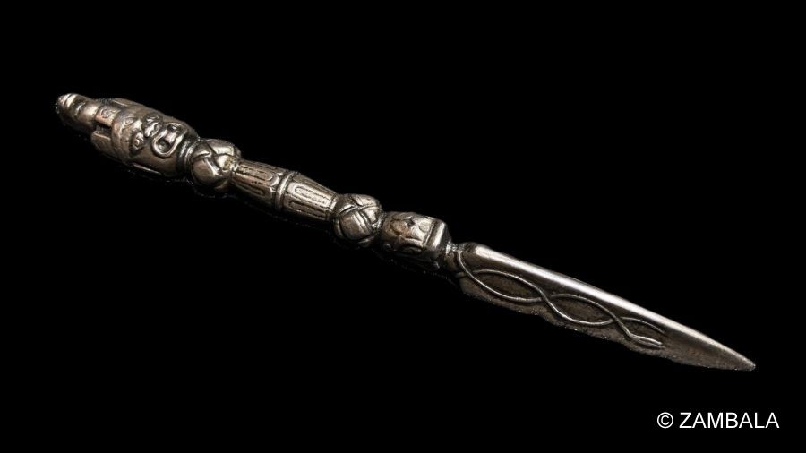 在天鐵普巴杵(Thogcha Phurba),又稱「天鐵普巴金剛杵」或簡稱「普巴杵」,是藏傳佛教(特別是寧瑪派和薩迦派)中一種極具象徵性和實用性的法器。它由西藏人稱為「天鐵」(Thogcha)的特殊材質——鎳鐵隕石(iron-nickel meteorite)——鑄造而成,這種隕石被視為蘊含強大宇宙能量和磁場的「天降之鐵」,具有辟邪、鎮壓魔障的超自然力量。 普巴杵的外形通常為三稜狀尖刃(象徵三身、三昧耶或三毒的轉化),柄部裝飾蓮花、骷髏冠和金剛結,頂端有普巴金剛本尊的忿怒相,總長約20-40公分。 它不僅是儀式道具,更是修行者修持普巴金剛(Vajrakīla)法門的核心本尊法器,體現了密宗「轉化負能為正智」的哲學。