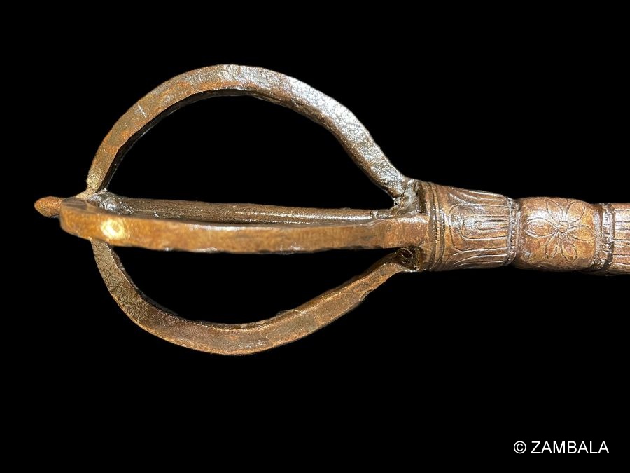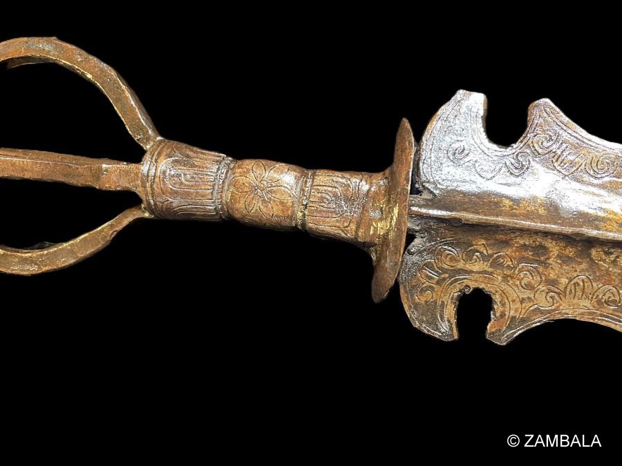 五股文殊智慧劍,又稱文殊智慧劍或文殊降魔劍,是佛教中文殊菩薩的主要法器之一。其特徵是劍身通常以藍色鐵製成,呈雙刃設計,劍身盤繞火焰圖案,劍柄以黃金鍛造,頂端特別飾以半截五股金剛杵(五股象徵五智與五方佛),劍尖周圍放射智慧之火,象徵敏銳的覺識與斷滅愚痴的能力。