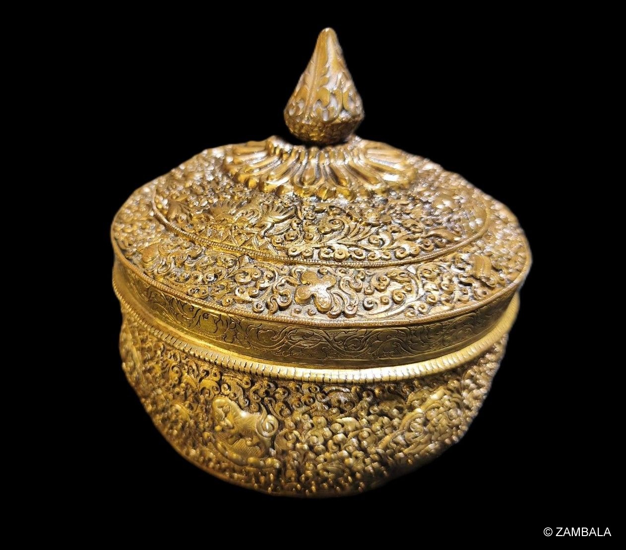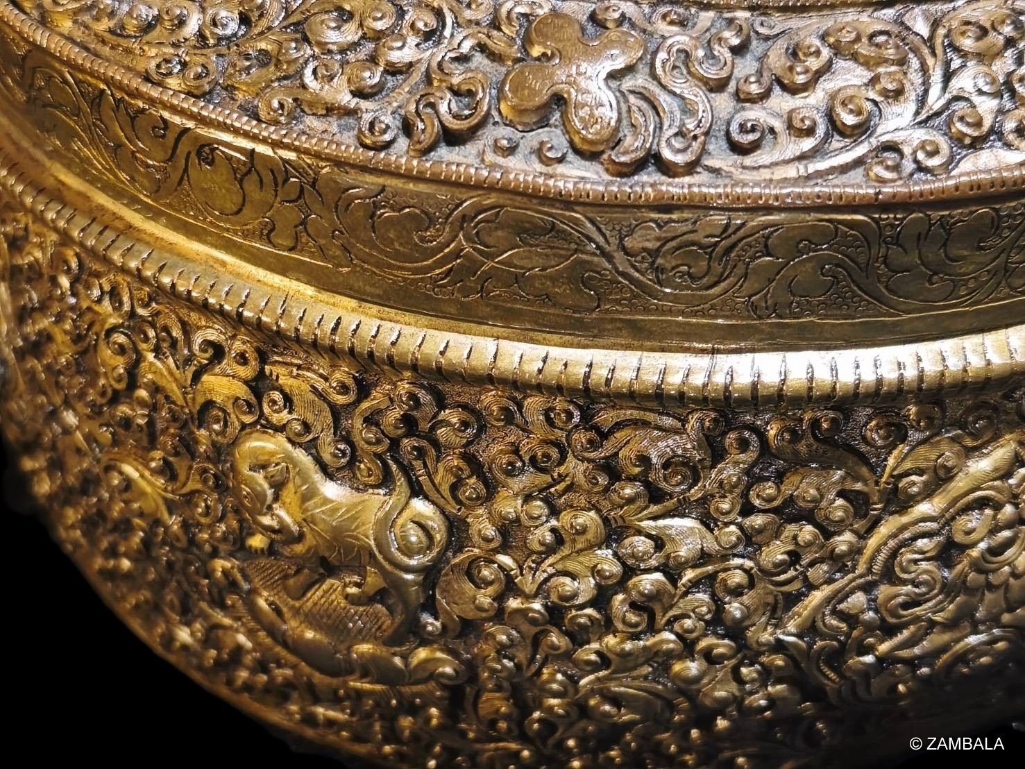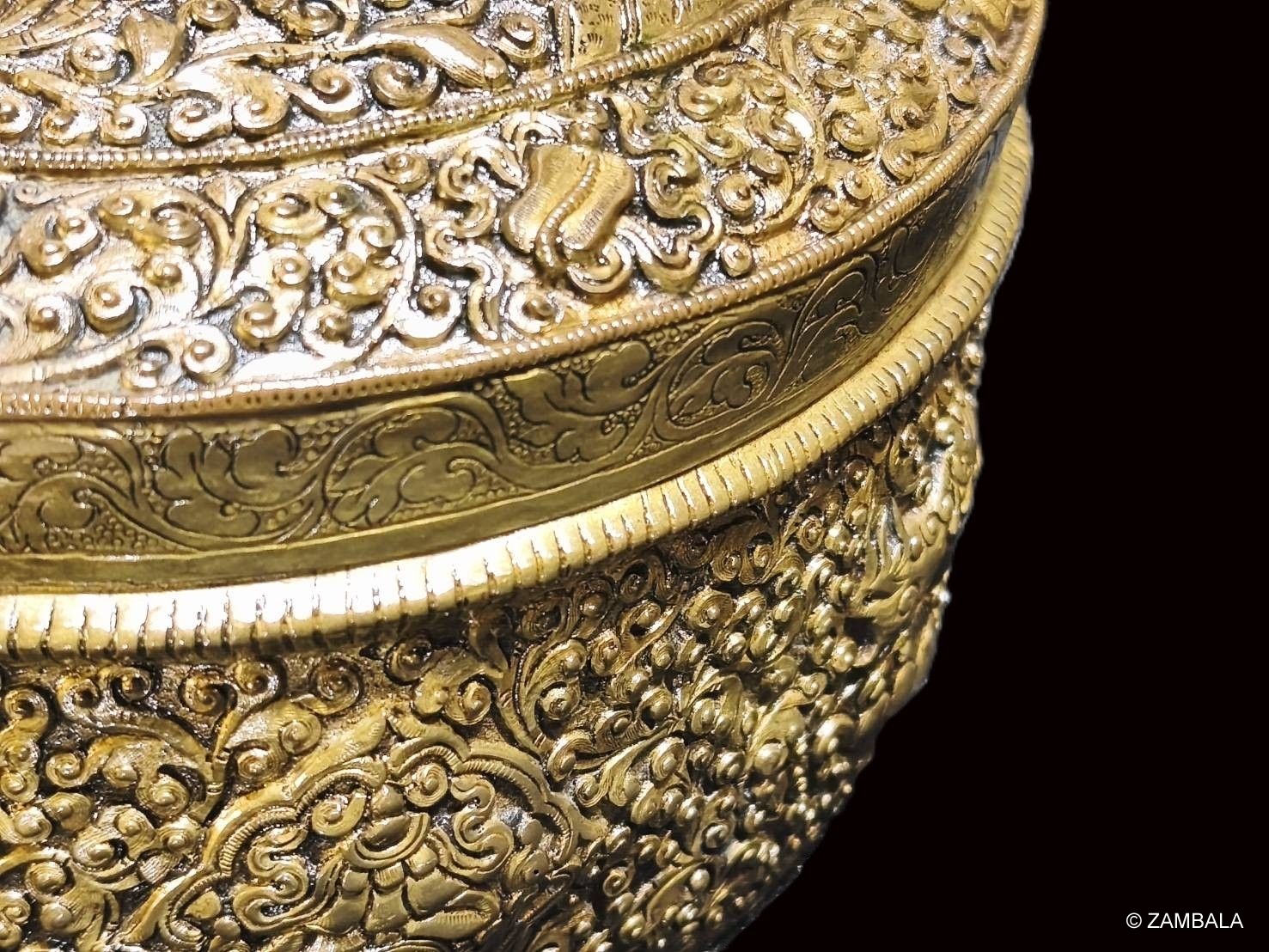 - **寶瓶**:象徵財富和長壽,瓶中裝滿甘露,代表永不枯竭的福報。代表佛陀的頸部。
