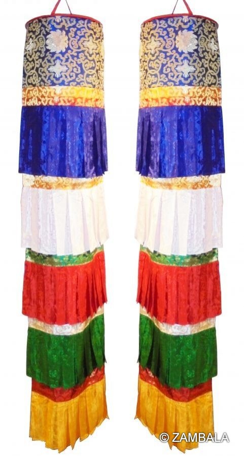 藏式勝利幢(Tibetan Victory Banner),在藏傳佛教中稱為「嘉辰」(Gyaltshen),是佛教八吉祥符號(Ashtamangala)之一。它通常被描繪為一個懸掛著彩色絲帶或布幔的旗幟,頂部有寶石或日月裝飾,底部可能有蓮花或吊飾。這個符號不僅是裝飾性元素,還承載深刻的象徵意義,代表勝利、克服障礙與精神成就。在藏傳佛教藝術、寺廟建築和日常用品中,勝利幢經常出現,如寺廟屋頂的銅製旗幟或唐卡畫作中。