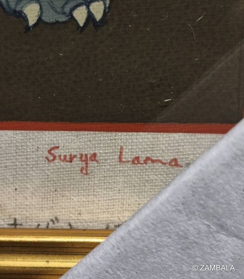 - **創作過程**:一幅唐卡的完成需數週至數月,首先繪製草圖,確保符號(如曼荼羅或護法神)的準確性,然後層層上色與描金。Surya Lama 強調冥想與靈性投入,創作時視為修行的一部分,讓作品不僅是視覺藝術,還蘊含祝福與能量。他的風格被形容為「純金純礦繪製」,金色元素不僅裝飾,還象徵啟蒙與繁榮。