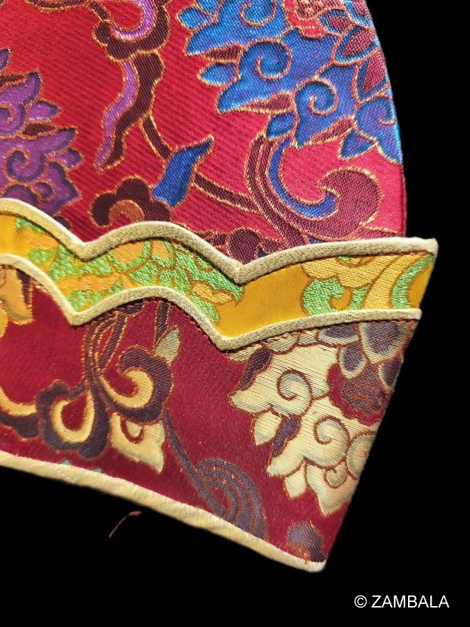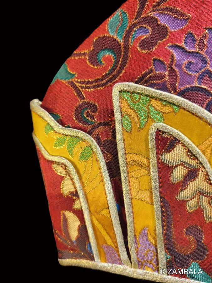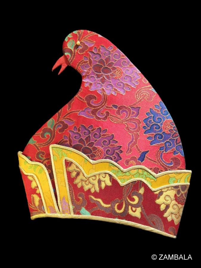 1. **準備階段(Empowerment and Blessing)**:法會前,冠冕須由具格上師(如寧瑪派喇嘛)在札仲遺骨前進行灌頂(empowerment)。這包括誦讀瑜伽密咒、灑淨水,並以五色絲帶或寶石強化其護力。冠冕的構造包括藍色底座、五片黃色上翻帽簷(象徵五智)、三隻刺繡眼睛(覺察萬法)、銀質金剛杵(vajra,象徵不壞)、太陽與新月金屬盤(時間超越),以及前額的真言板(刻有馬哈嘎拉心咒)。內層可能繡骷髏頭(死亡覺醒),外層則飾迦樓羅(garuda)或雷龍(thunder dragons),以調和憤怒與智慧能量。