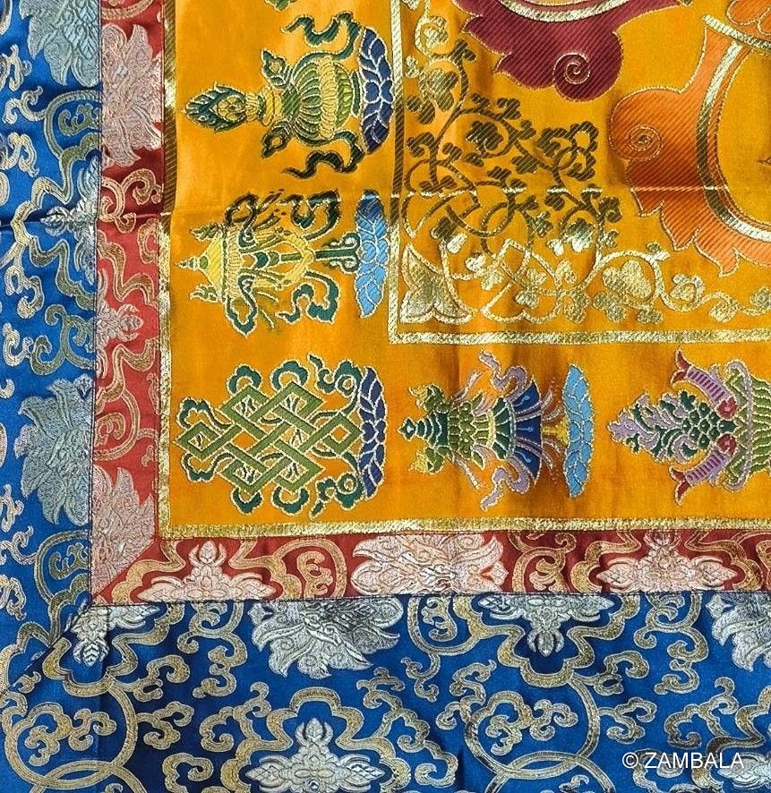 3. **修持輔助與家居祥和**:在靜修閉關中,可冥想或繪製於禪座下方,穩定定力;或刻於金屬板封底佛像,強化加持。 在居家佛堂,它作為桌布增添藝術與宗教氛圍,象徵絕對定力與圓滿,助信眾增長善根、滿足怨敵。 整體而言,它不僅是裝飾,更是連結物質宇宙與精神修道的橋樑,強調藏傳佛教的「無上瑜伽」與五身統一。