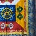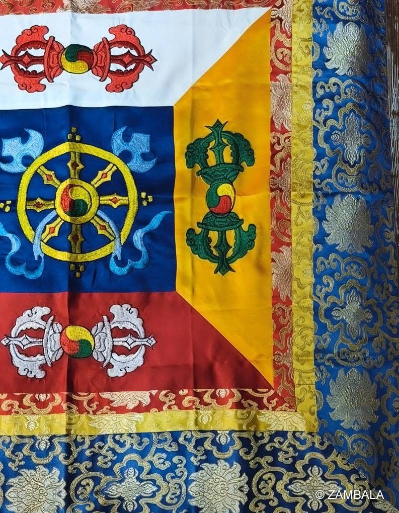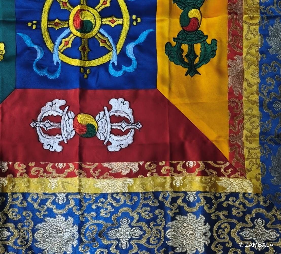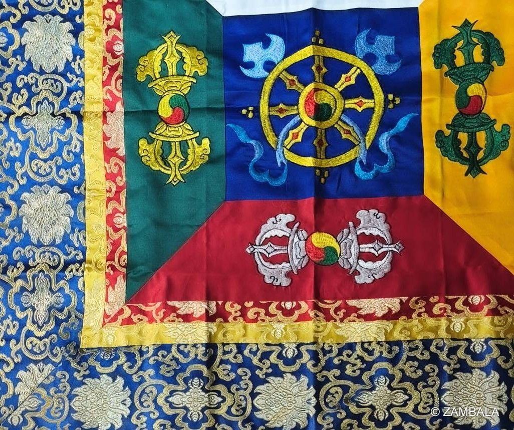 1. **材質選擇**:主要使用絲綢、錦緞、棉麻或羊毛織物,耐用且具光澤,象徵純淨與堅韌。有些高檔品融入彩色印染或金絲線,增強視覺莊嚴感。 例如,不丹刺繡款以彩色織布為基底,確保顏色鮮豔持久。