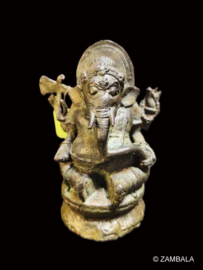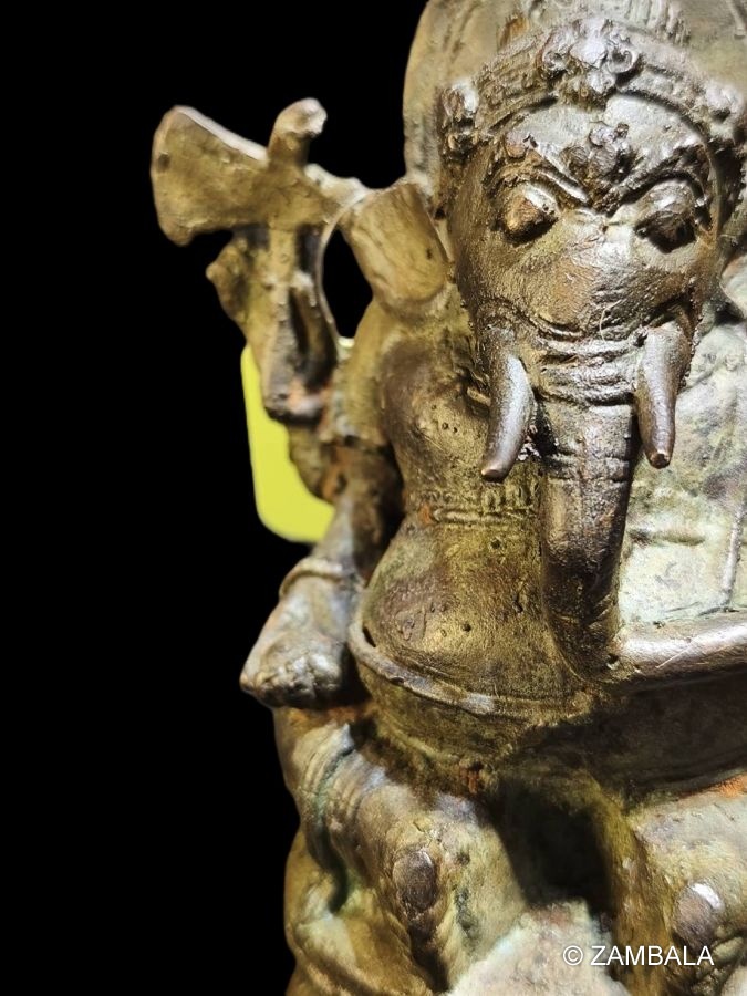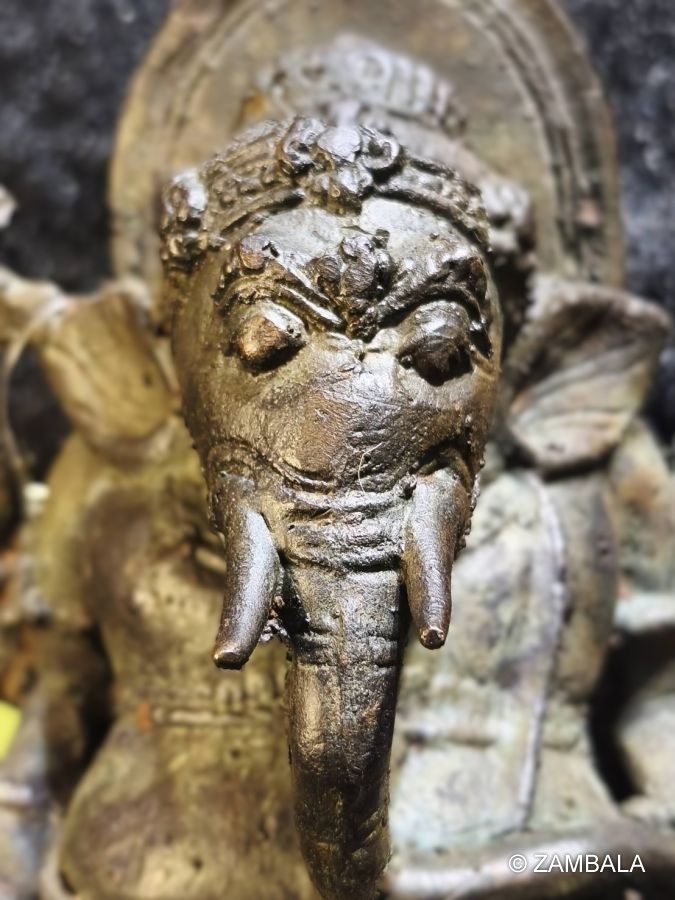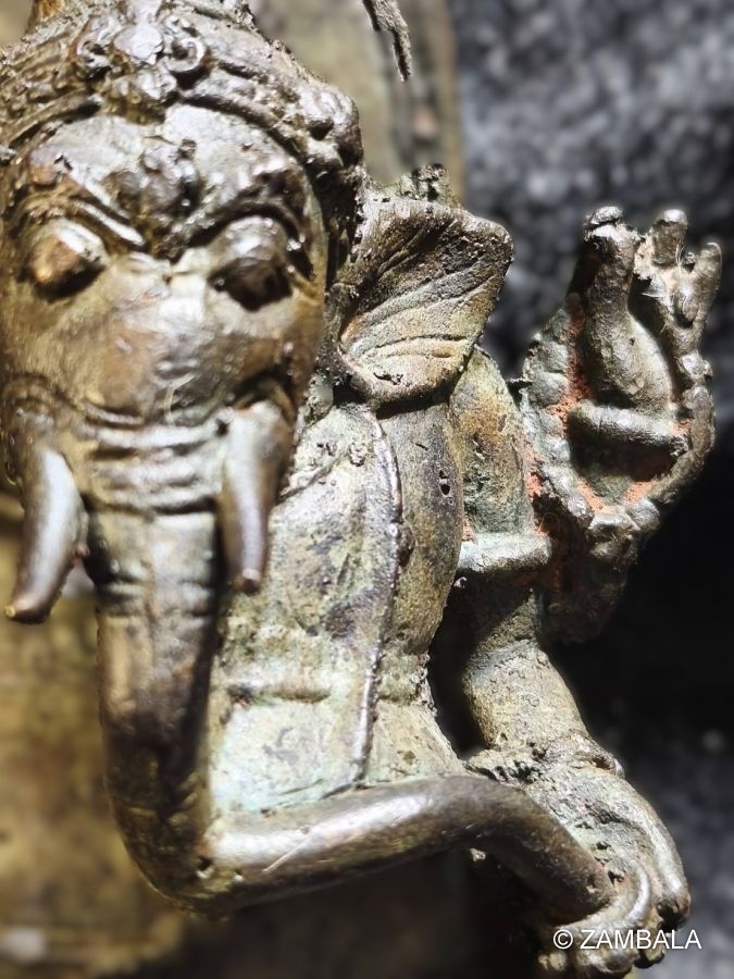 在遙遠的古印度,象鼻財神是主神濕婆(Shiva)與雪山神女帕爾瓦蒂(Parvati)的兒子。相傳帕爾瓦蒂某日沐浴時,用薑黃膏(或蜂蜜與薑黃的混合物)在門口捏成一個男孩,賦予其生命,讓他守護浴室,不許任何人進入。這男孩忠心耿耿,手持武器,嚴守職責。 當濕婆神從遠方歸來時,不知情地欲進入浴室,男孩堅決阻擋,導致雙方爆發激烈衝突。憤怒的濕婆一劍斬下男孩的頭顱,帕爾瓦蒂聞訊悲痛欲絕,責令濕婆復活兒子。