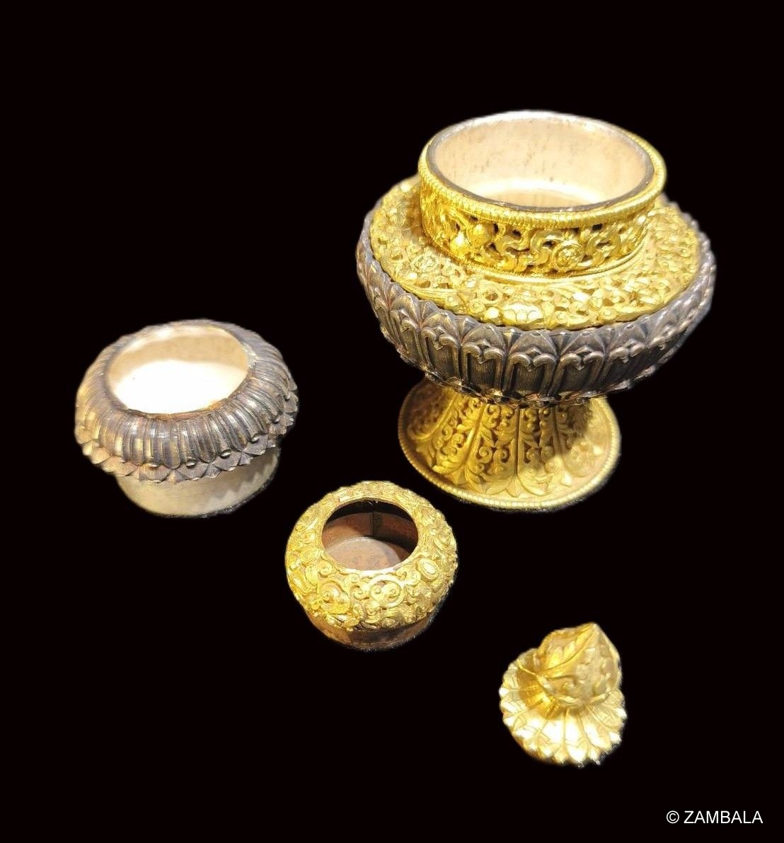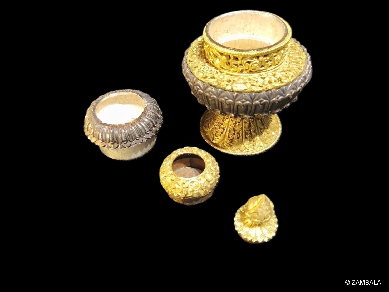 修法米罐通常由金屬製成,如銅或鎏金,並且可能刻有咒語或佛教象徵,以增強其法力。使用時,修行者會在米罐中放入米粒,並誦持特定的咒語,如「變食真言」,使食物變得充滿法力,能夠遍及十方,利益眾生。