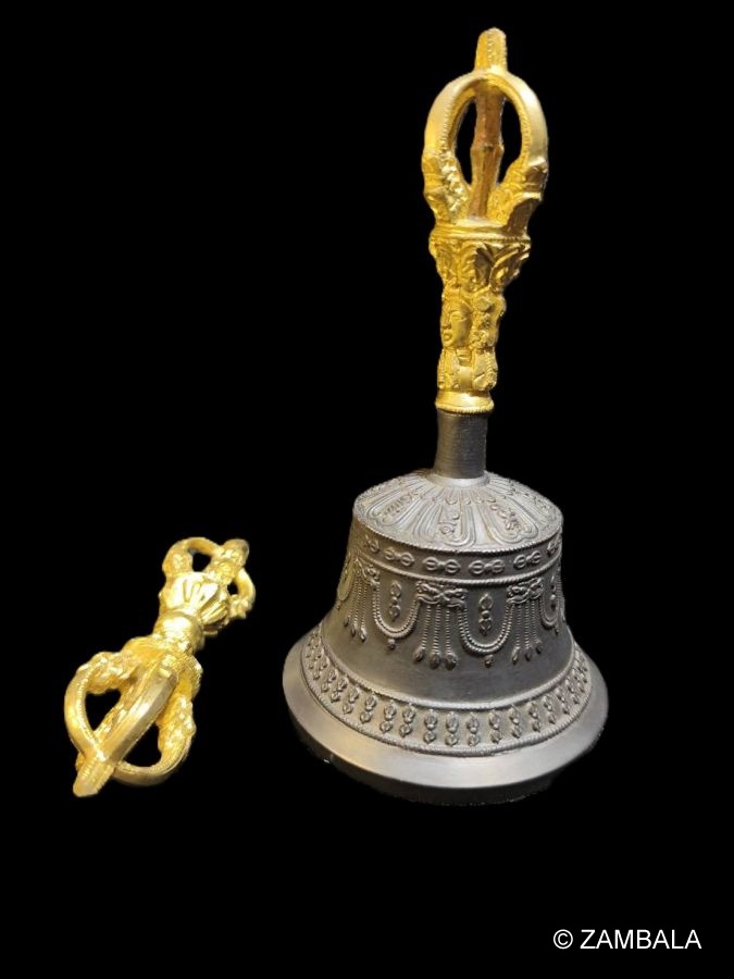 - 鈴的上半部是半金剛杵:象徵方便與智慧本來無二。