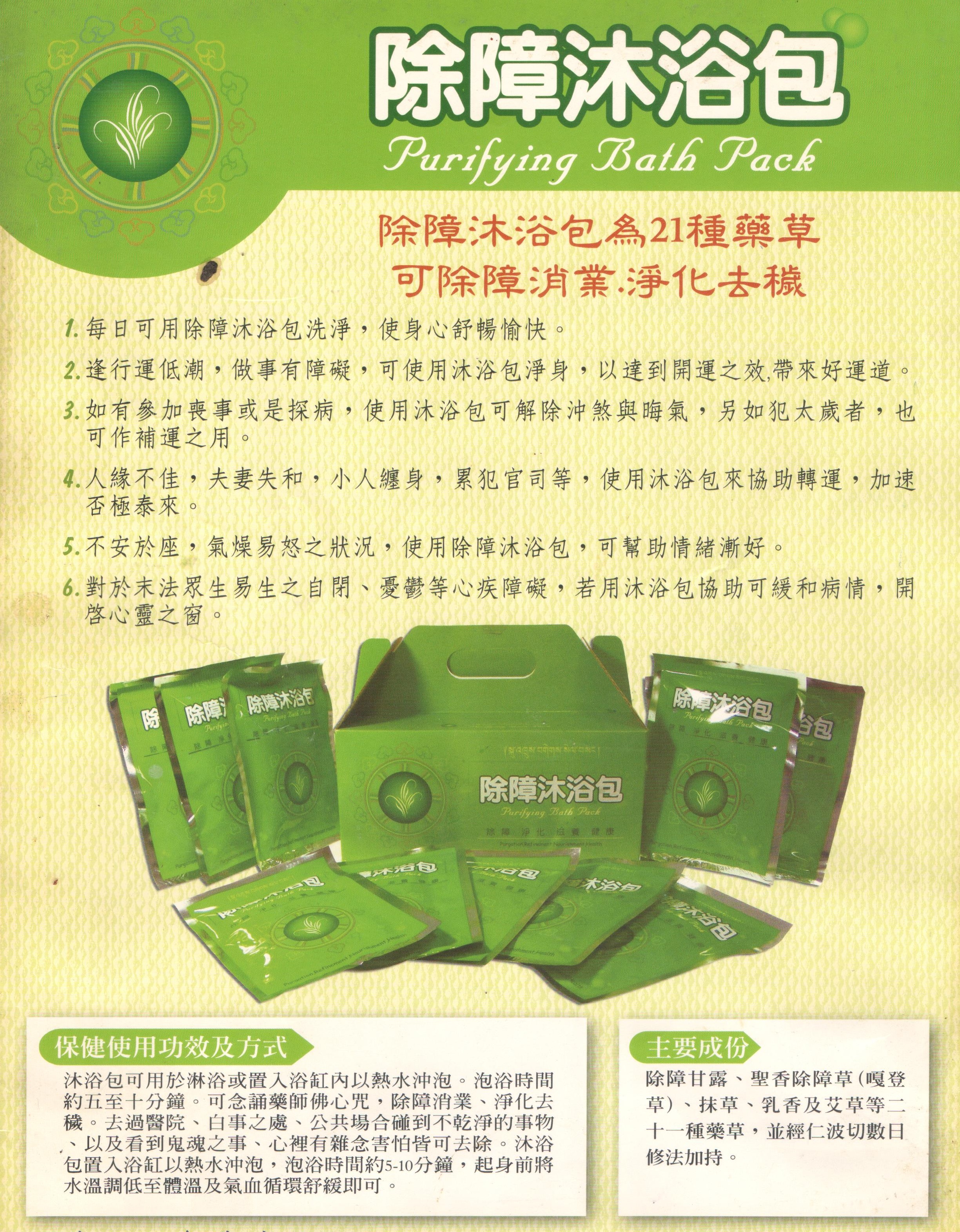主要成分 : 除障甘露、聖香除障草(嘎登草)、抹草、乳香及艾草等二十一種藥草,並經仁波切數日修法加持。