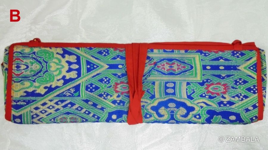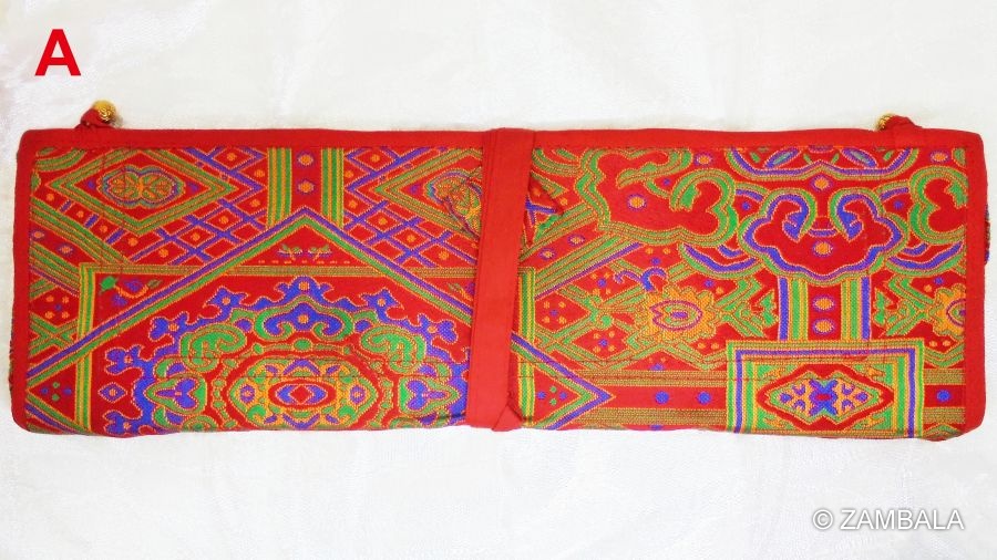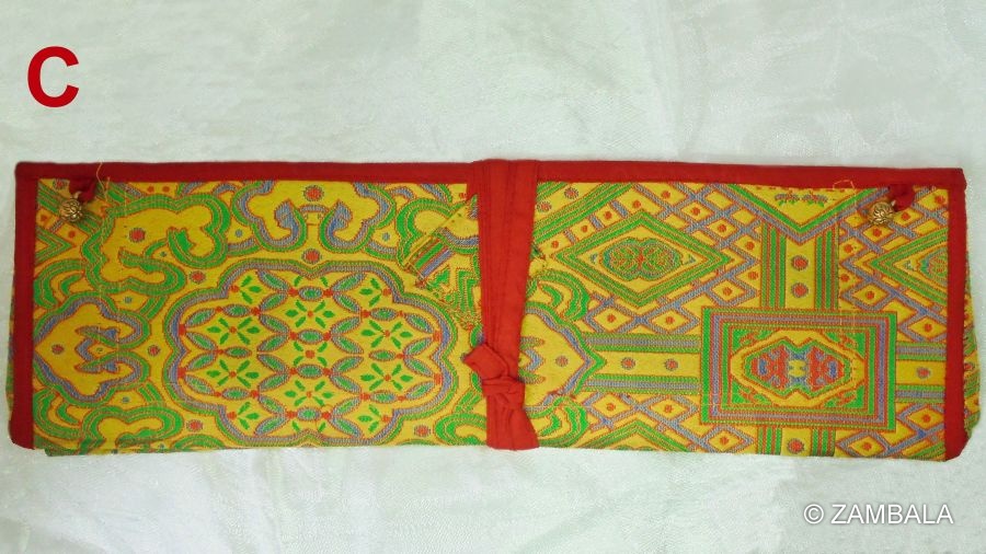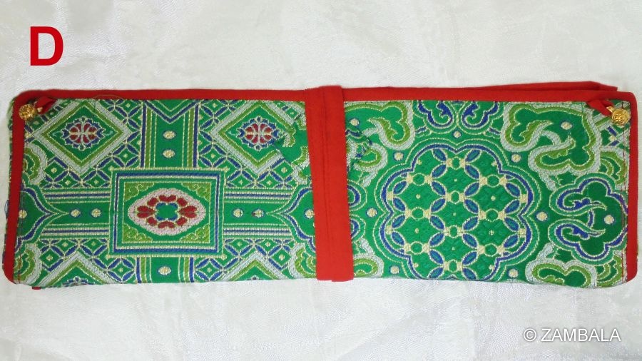 在使用方式上,法本夾主要用來夾住長條形的經文頁面(稱為pecha),頁面通常是水平長形、鬆散疊放而不裝訂。將經文置於兩塊木板之間,然後用布料(如絲綢或錦緞)包裹起來,以防止頁面散落並保護免受灰塵和損壞。閱讀時,從布包裹中取出,右手持夾,從右向左逐頁翻閱,通常在誦經或儀式中使用。存放時重新包裹好,置於寺廟或個人壇城中,象徵對佛法的尊重。