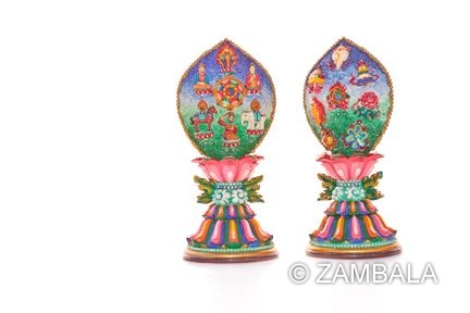 - **象徵性應用**:每個符號都有特定功能。例如,法輪代表佛陀的八正道(Eightfold Noble Path),在轉經輪或法會中用來傳播教義向八方。 在西藏佛教中,這些符號用於密宗儀式,幫助修行者冥想和視覺化靈性成長;而在尼泊爾佛教中,拂塵(有時取代法輪)象徵密宗顯現,用於淨化儀式。 整體而言,它們不僅是儀式道具,還作為地位符號或神明象徵,強調場合的吉祥與繁榮。
